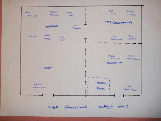 Đây là sơ đồ văn phòng tại Stevens Creek được Johnson vẽ lại. Johnson nói nơi này rất nhỏ và được bố trí đơn giản. Jobs và Wozniak làm việc cạnh nhau.