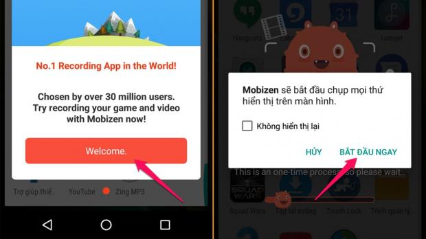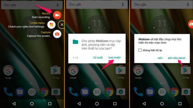 Chọn tính năng ghi hình (biểu tượng chiếc camera) > cho phép Mobizen Screen Recorder sử dụng thư viện ảnh và micro. Tại giao diện mới xuất hiện, nhấn nút 'Bắt đầu ngay' để tiến hành quay video màn hình thiết bị sau khi đếm ngược ba giây.