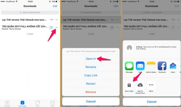 Để lưu video vào bộ nhớ máy (thư viện ảnh) bạn nhấn vào biểu tượng ba chấm ở bên phải liên kết tải > chọn Open In > tiếp tục chọn Save Video.