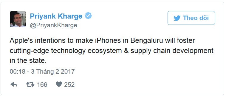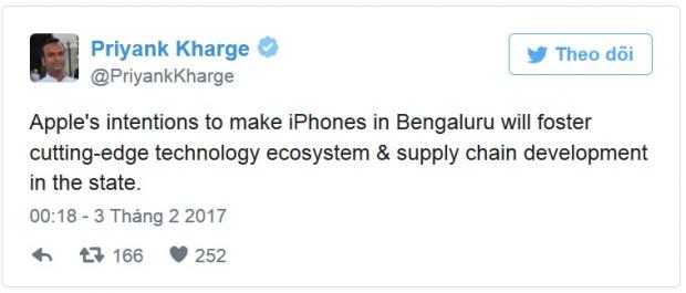 Ông Priyank Kharge - Bộ trưởng Công nghệ Thông tin bang Karnataka (Ấn Độ) vừa viết trên trang Twitter cá nhân rằng Apple sẽ sản xuất iPhone tại nước này từ tháng 4/2017.