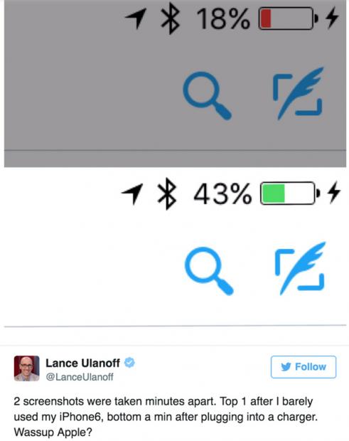 Lance Ulanoff, nhà báo công nghệ của tờ Mashable đưa ra những phàn nàn về pin của iPhone. Theo đó, ông đã sử dụng chiếc iPhone 6 được 18 tháng, không làm rơi hay va đập. Tuy nhiên, máy vẫn xảy ra một số vấn đề với pin. Đôi lúc, nó sạc rất nhanh, từ 18 lên 43% chỉ trong một vài phút.