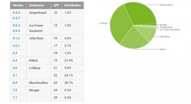 Trong khi đó, Lollipop vẫn là phiên bản được cài đặt nhiều nhất hiện nay trên các thiết bị Android với 32.7%, xếp ngay sau đó là Marshmallow với 30.7%.