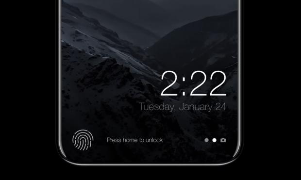 Phím Home vật lí được lược bỏ hoàn toàn, viền bezel siêu mỏng và màn hình cong nhẹ ở hai cạnh bên. Ở trạng thái khóa màn hình, thiết bị hiển thị biểu tượng quét vân tay ở góc bên trái phía dưới và người dùng sẽ đặt ngón tay vào đây để nhận diện. Đây được đánh giá là ý tưởng này khá độc đáo, có tính đột phá trong bối cảnh những sáng tạo ở mảng smartphone đã đến giai đoạn bão hòa. Trông chiếc iPhone 8 trong concept này vô cùng thanh lịch.