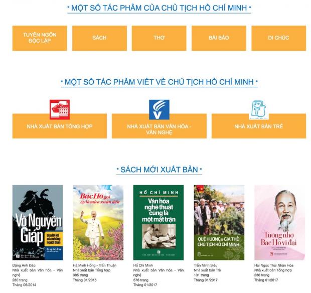 Giao diện của Thư viện sách điện tử về Bác rất đơn giản, chia ra nhiều đề mục chi tiết.