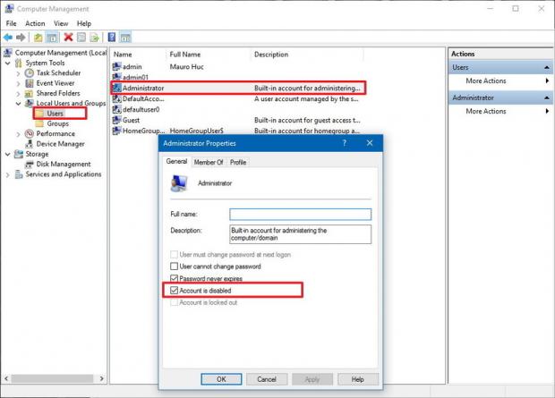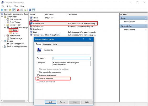Ngoài ra, để tắt tính năng tài khoản Admin được tích hợp sẵn trong Windows 10, thực hiện tương tự các bước 'Hướng dẫn kích hoạt tài khoản Administrator', và chọn lại phần Account is disabled để tắt tài khoản Admin đi.