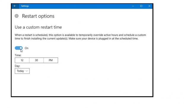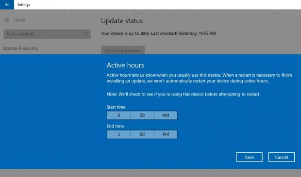 Nhấn Save để đặt giờ máy tính hoạt động. Bạn có thể đặt tối đa 12 giờ, 12 giờ còn lại sẽ được dùng cho Windows khởi động lại khi update. Nhưng ngay cả trong thời gian bạn chỉ định máy tính hoạt động, Windows sẽ kiểm tra chắc chắn rằng bạn không sử dụng máy tính của bạn trước khi khởi động lại.