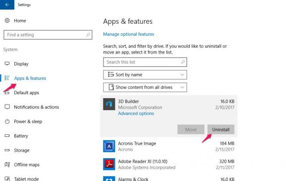Vào Settings > System > App & features. Chọn Uninstall để gỡ cài đặt ứng dụng không mong muốn.
