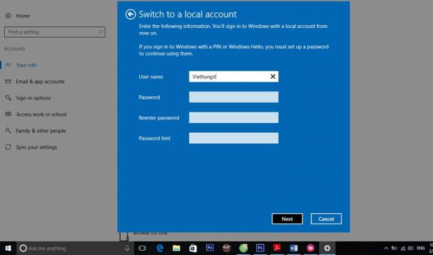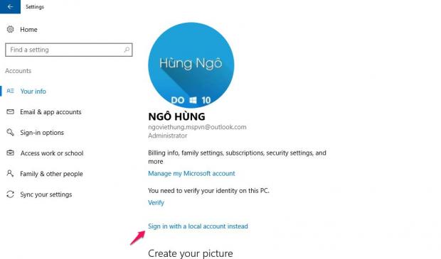 Cách 2: Nếu bạn đã đăng nhập tài khoản Microsoft rồi, hãy vào Settings > Accounts > Your info > Sign in with a local account instead để tạo tài khoản đăng nhập cho riêng mình.
