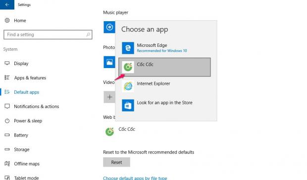 Vào Settings > System > Default Apps. Tìm đến mục trình duyệt, chọn trình duyệt bạn mong muốn.