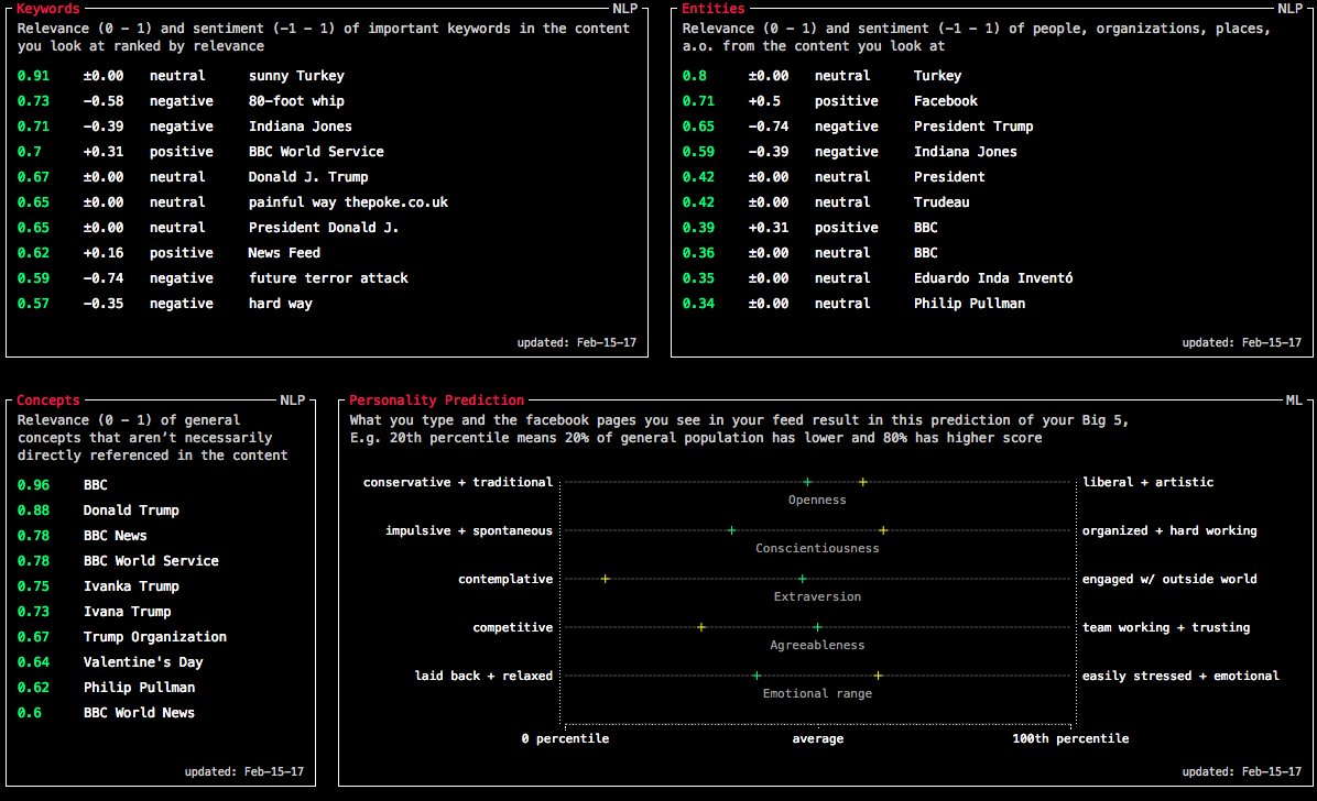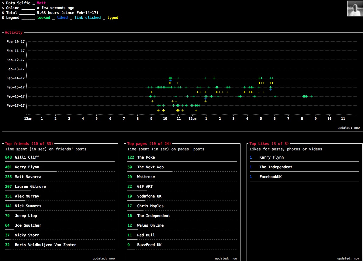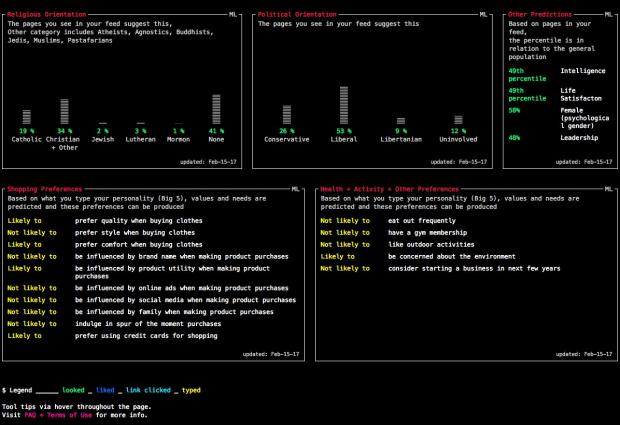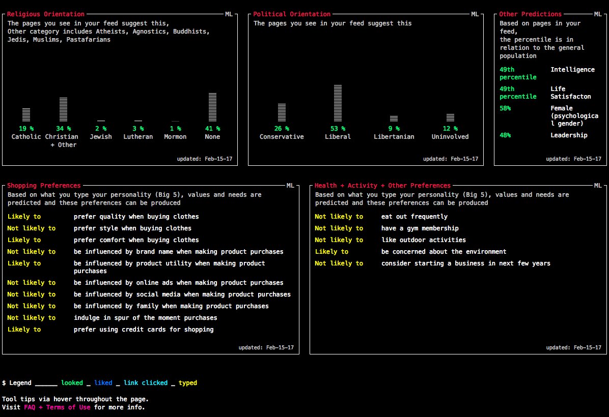 Thêm vào đó, bảng điều khiển của Data Selfie đều có những báo cáo chi tiết về những bài viết mà bạn dành thời gian để xem nhiều nhất, kể cả của bạn bè hay các trang đã thích. Theo một cái nhìn đáng sợ nhưng đầy thú vị, tiện ích này còn có khả năng sử dụng thuật toán phân tích dự báo để đoán được sở thích mua sắm, thức ăn, sản phẩm yêu thích, kể cả các quan hệ chính trị.