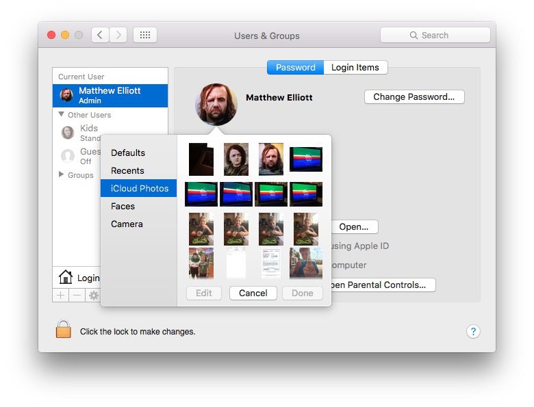 Để thay đổi ảnh avatar cho bất kỳ tài khoản người dùng nào khác, bạn phải bấm vào hình ổ khóa ở góc dưới cùng bên trái sau đó nhập password để thực hiện các thay đổi cho hệ thống tương tự như các thao tác nói trên.