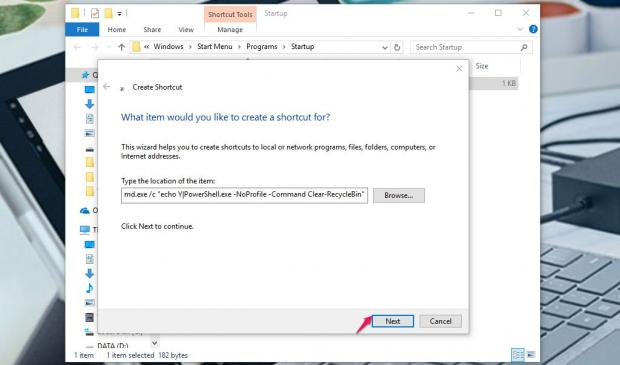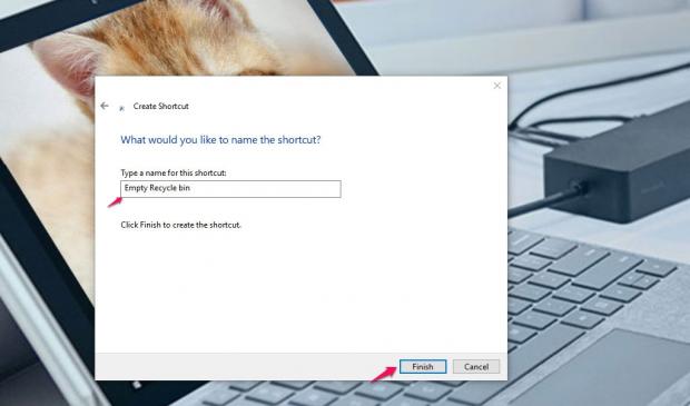Click Next > Đặt tên: 'Empty Recycle bin' > click Finish để hoàn tất quá trình tạo shortcut khởi động