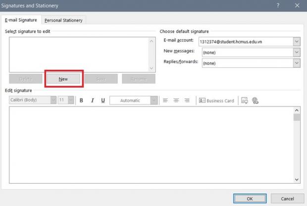 Trong cửa sổ tạo chữ ký mới, chọn New để tạo chữ ký.