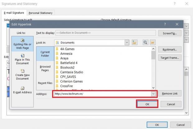 Bạn cũng có thể thêm địa chỉ liên kết vào hình ảnh hoặc logo của công ty. Chọn hình ảnh muốn chèn liên kết, rồi nhấp vào biểu tượng Insert Hyperlink (biểu tượng hình trái đất với dây xích). Nhập vào đỉa chỉ URL để liên kết đến trang cá nhân hoặc công ty. Rồi bấm OK.