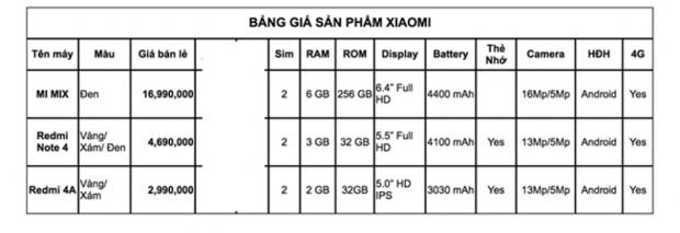 Trên đây là hình ảnh bảng giá những chiếc smartphone chính hãng đầu tiên của Xiaomi được bán ra tại Việt Nam. Vậy là thời gian đầu, chỉ có ba sản phẩm là Redmi 4A, Redmi Note 4 và dĩ nhiên, không thể vắng mặt siêu phẩm hiện nay của hãng là chiếc smartphone không viền Mi MIX.