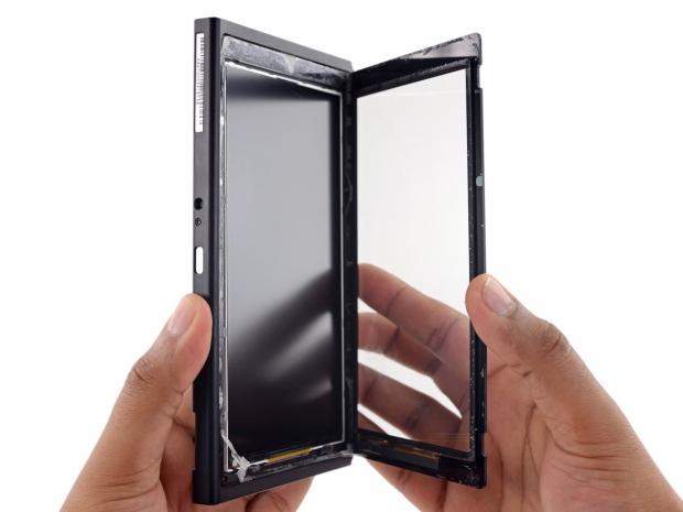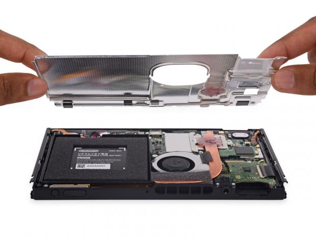 Nằm dưới tấm kim loại là viên pin dung lượng lớn 16Wh kèm hệ thống ống nhiệt và quạt tản nhiệt. Nintendo không cố định màn hình với tấm nền cảm ứng như trên hầu hết các thiết bị thông minh có sử dụng màn hình cảm ứng hiện nay mà tách rời hai thành phần này khiến chi phí sửa chữa nếu không may màn hình bị vỡ sẽ rẻ hơn khá nhiều. Một điểm cộng nữa là màn hình LCD rất dễ được tháo rời.