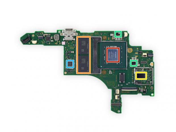 Các thành phần khác trên mặt bên kia của bo mạch gồm chipset NVIDIA ODNX02-A2 (màu đỏ), hệ thống DRAM Samsung K4F6E304HB-MGCH 2 GB LPDDR4 (màu cam), chip WiFi Broadcom BCM4356 802.11ac 2×2 và Bluetooth 4.1 (màu vàng).