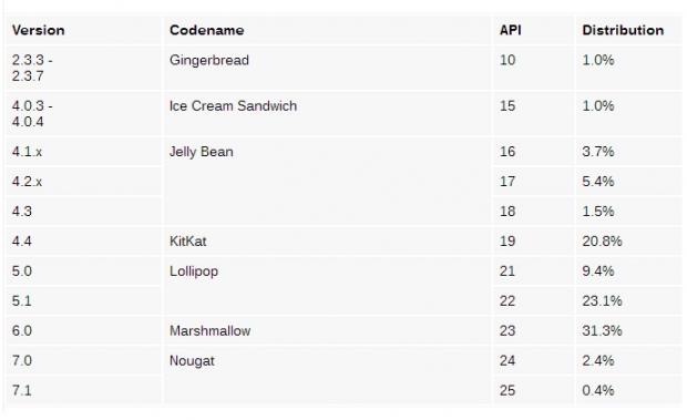 Phiên bản Android 4.4 KitKat vẫn chiếm phần trăm khá cao số thiết bị chạy phiên bản này với 20.8%. Android Nougat tăng gấp đôi từ 1.4% lên 2.8% bởi trong sự kiện MWC 2017 vừa qua đã có khá nhiều thiết bị được nhà sản xuất giới thiệu chạy phiên bản này.