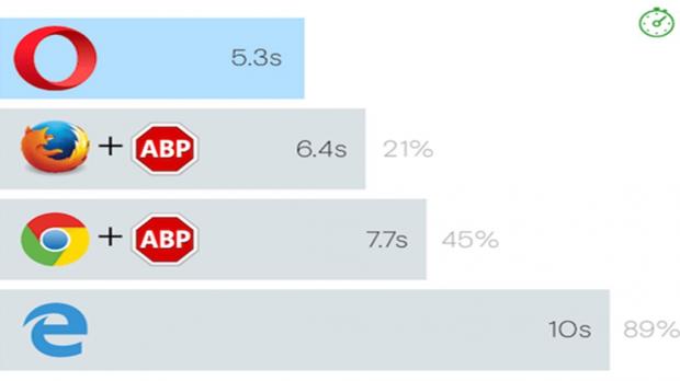 Với tính năng chặn quảng cáo tích hợp và VPN, Opera đem đến cho người dùng tốc độ và bảo mật quyền riêng tư hơn. Theo thử nghiệm, khi tích hợp tiện ích chặn quảng cáo, tốc độ tải trang của Opera trung bình chỉ mất 5,3 giây, nhanh hơn 21% so với Firefox (6,4 giây), hơn Chrome 45% (7,7 giây) và gần như là nhanh gấp đôi so với trình duyệt Microsoft Edge (10 giây).