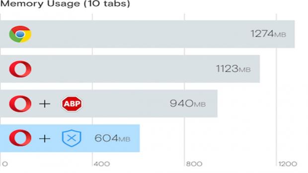 Cũng theo thử nghiệm của Opera, khi lướt web trên trình duyệt với 10 tab khác nhau và chặn quảng cáo, trình duyệt Opera chỉ tốn 604MB dung lượng RAM. Trong khi đó, sử dụng trình duyệt Google Chrome mà không chặn quảng cáo thì cần tới 1274MB RAM, sử dụng trình duyệt Opera mà không chặn quảng cáo thì cần tới 1123MB RAM, sử dụng trình duyệt Opera kèm chương trình chặn quảng cáo của bên thứ ba thì cần 940MB RAM. Như vậy trình duyệt Opera là trình duyệt tối ưu RAM nhất.