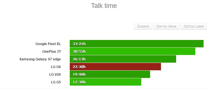 Đầu tiên, LG G6 sở hữu thời gian đàm thoại liên tiếp lên đến 22h30 phút và cao hơn hai người đàn anh của mình là LG G5 và LG V20.