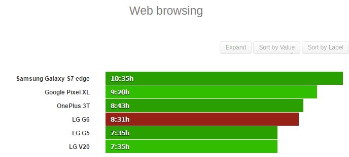 Tiếp theo là bài thử nghiệm lướt web với Wi-Fi, LG G6 đã hoàn thành thử thách với 8 giờ 31 phút trong khi hai người tiền nhiệm của mình chỉ dừng lại ở con số 7h35 phút. Tuy nhiên, cải tiến về dung lượng pin của thiết bị đến từ LG vẫn chưa đủ khi model này vẫn bị các đối thủ như One Plus 3T, Google Pixel XL và Galaxy S7 edge dẫn trước.