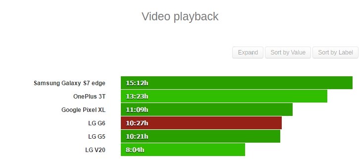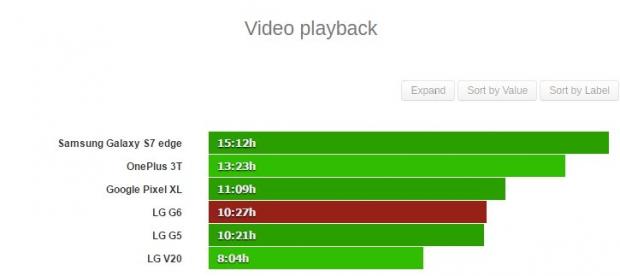 Trong bài thử nghiệm chơi video, LG G6 có thời gian đạt 10 tiếng 27 phút, cao hơn một chút so với LG G5 và vượt xa con số 8 giờ 04 phút của LG V20. Ba thiết bị còn lại trong bài test này là Galaxy S7 edge, One Plus 3T và Pixel XL có thời lượng pin lần lượt là 15 giờ 12 phút, 13 giờ 23 phút và 11 giờ 09 phút.