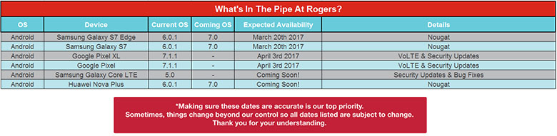 Trong lịch trình cập nhật Android thể hiện rõ, các thiết bị như Galaxy S7, S7 Edge thời điểm từ Android 6.0.1 lên bản 7.0 là ngày 20/3, Huawei Nova Plus đang chạy Android 6.0.1 (có thể lên Android 7.0) và Galaxy Core LTE chạy Andoird 5.0 (chưa rõ bản cập nhật sẽ nhận được) ngày cập nhật chưa xác định.