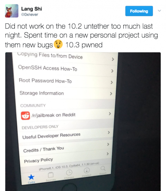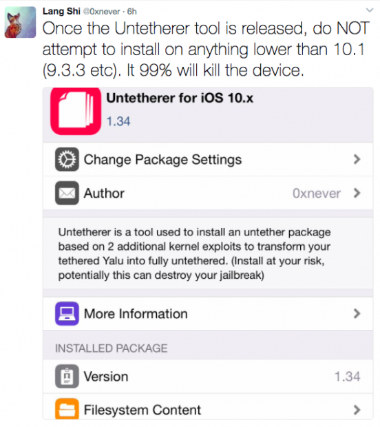 Nếu chưa biết thì Lang Shi hay nick Twitter là @0xnever đã dành thời gian nghiên cứu các lỗ hổng trên iOS 10 và đã tìm ra cách để jailbreak untether, khác với Yalu của Luca Todesco vẫn là semi-tether (nếu khởi động lại máy thì cần jailbreak lại để sử dụng các tweak, còn tether là muốn khởi động lại và sử dụng được thiết bị thì bắt buộc phải cắm vô máy tính jailbreak lại), do đó Untether Jailbreak vẫn là giải pháp được mong chờ nhất.