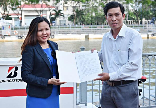 Chị Dương An Giang - Tổng quản lý cấp cao Bridgestone Việt Nam bàn giao xe đạp lọc nước cho Trưởng ban quản lý đường hầm sông Sài Gòn.