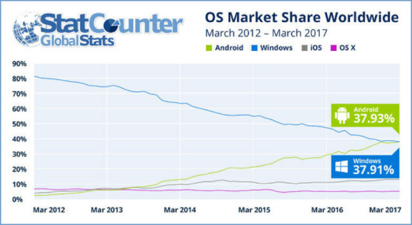 Nhìn vào biểu đồ trên ta có thể hình dung khái quát về bức tranh toàn cảnh của nền tảng di động trong thời gian tới. Cụ thể, Windows liên tục giảm thị phần từ 82% trong năm 2012 xuống 37,91% (3/2017), thì Android không ngừng tăng lên từ con số 5,4% khởi đầu khiếm tốn cách đây 5 năm lên đến 39,93% (3/2017). Trong khi đó, các hệ điều hành iOS và OS X vẫn duy trì ổn định qua các năm.
