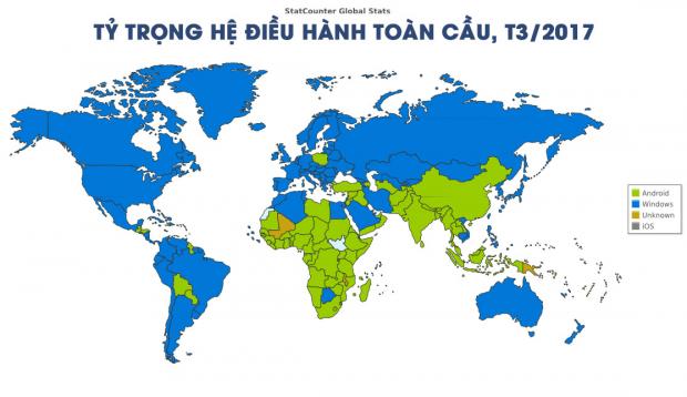 Đó chính kết quả khảo sát vừa công bố bởi StatCounter về tình hình sử dụng internet toàn cầu và theo đó: lượng sử dụng internet từ Android trong tháng 3 đã chiếm tỷ trọng cao nhất với 37,93%, Windows lui về vị trí thứ 2 với 37,91%. Xếp thứ 3 tính về tỷ trọng sử dụng internet là iOS với 13,09% và theo sau là 5,17%. Cuối cùng Linux đứng chót với 0,75%.