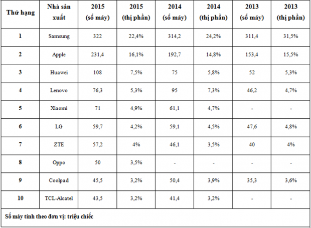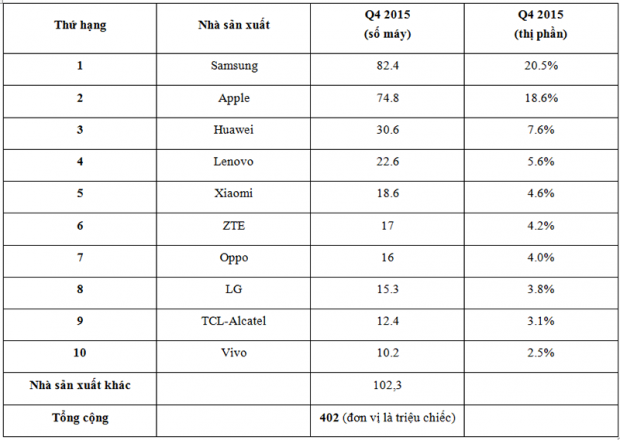 Trong quý 4/2015, quý tiêu thụ mạnh nhất trong năm thì xu hướng trên vẫn không thay đổi. Apple và Samsung thống trị hai ngôi đầu, trong khi các công ty vẫn tiếp tăng trưởng ổn định.