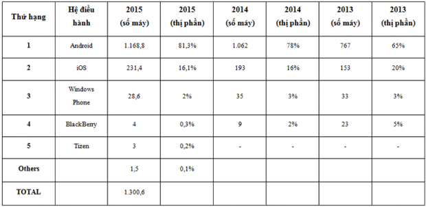 Về nền tảng hệ điều hành, Android và iOS là hai nền tảng thống trị với tổng cộng 97,4% thị phần (Android có 81,3% và iOS có 16,1%) trong năm 2015. Cả Windows Phone và BlackBerry đều suy giảm mạnh thị phần trong năm vừa qua, đặc biệt nền tảng BlackBerry giờ chỉ còn có 0,3% thị phần.