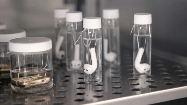 Khung đồng hồ và tai nghe AirPods được Apple ngâm trong dung dịch mô phỏng mồ hôi người để đảm bảo độ an toàn khi đeo trong thời gian dài cho người dùng.