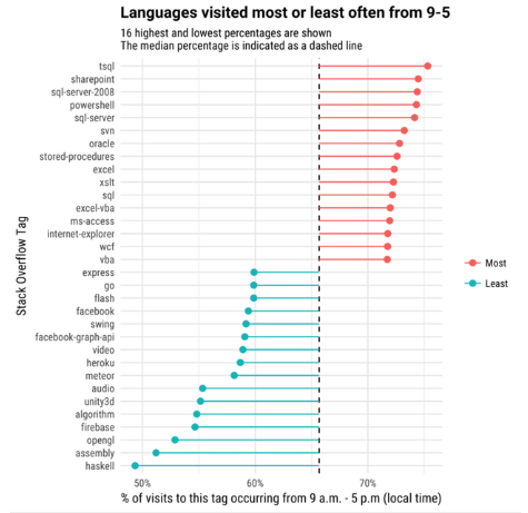 Bên cạnh đó không ngạc nhiên gì khi các phần mềm framewwork được sử dụng nhiều nhất trong ngày có liên quan đến các ứng dụng dành cho doanh nghiệp của Microsoft như Sharepoint và SQL Server. Tuy nhiên một lần nữa thứ tự lại đảo lộng vào ban đêm khi Stack Overflow ghi nhận các ngôn ngữ và framewwork kém nổi bật như Haskell, Meoteor và Go soars “lên ngôi”.