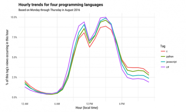 Cũng chính nhờ sự phổ biến rộng rãi với hàng tá ngôn ngữ lập trình mà Stack Overflow đã quan sát và ghi nhận được một xu hướng thú vị về người dùng. Như để trả lời cho câu hỏi “ngon ngữ lập trình nào phổ biến nhất hiện nay” , Stack Overflow cho biết chúng thay đổi tùy thuộc vào các khoàng thời gian trong ngày. Cụ thể là vào từ 6h sáng đến 5h chiều, C# của Microsoft cho thấy sự thống trị của mình khi chiếm tới 10% tổng số ngôn ngữ lập trình được dùng trên thế giới. Đây không phải là một điều quá bất ngờ, bởi C# từ trước đến nay vốn luôn rất thông dụng và được sử dụng rộng rãi, từ các doanh nghiệp hàng đầu thế giới cho tới các công ty startup mới thành lập.