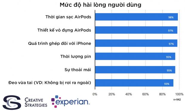 Kết quả khảo sát trên gần 1000 người tiến hành bởi Creative Strategies cho thấy có tới 98% người dùng cho biết đã hài lòng sau khi mua Apple AirPods.