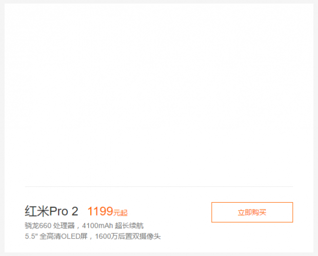 Mới đây, Redmi Pro 2 đã bị phát hiện có mặt trên trang web chính thức mi.com, tuy nhiên nó đã bị kéo xuống ngay sau đó. May mắn là các bức ảnh chụp màn hình đã kịp lưu lại thông tin về sản phẩm này, tiếc là không có hình ảnh sản phẩm đi kèm.