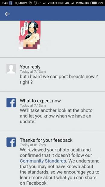 Theo những gì mình biết thì hầu hết các trường hợp xảy ra đều liên quan đến hình ảnh truyện tranh, cụ thể hơn chính là hình ảnh được lấy ra từ Anime/Manga (Hentai) và vẫn chưa thấy trường hợp nào về hình ảnh liên quan đến người thật cả. Nếu các bạn có gặp phải trường hợp tương tự thì hãy chia sẻ cho TCN biết ở phần bình luận bên dưới nhé. Đồng thời, cũng đừng nên đăng tải những tấm ảnh nude quá 'thô thiển' vì như vậy sẽ rất ảnh hưởng đến người khác và không có gì đảm bảo Facebook sẽ 'bỏ qua'.