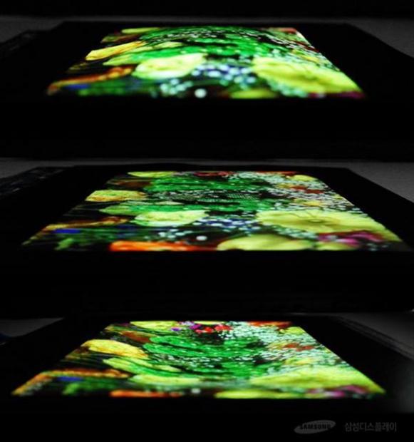 Đầu tiên, Samsung trình diễn những tính năng ưu việt như cuộn tròn, uốn cong hoặc thậm chí là kéo căng được 12mm trước khi khôi phục lại hình dạng ban đầu trên màn hình OLED 9.1 inch. Không giống như những chiếc màn khác chỉ có khả năng uống cong theo một chiều, màn hình mà Samsung đang nghiên cứu có thể co giãn cả hai hướng. Hiện Samsung vẫn chưa lên kế hoach đưa màn hình nào vào thiết bị nào nhưng những tính năng mà nó đang sở hữu chắc chắn sẽ thu hút không ít sự chú ý trong giới công nghệ.