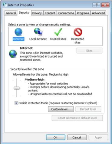 Từ cửa sổ Internet Options, chọn thẻ Security, sau đó bạn sẽ thấy từng biểu tượng cho mỗi khu vực an ninh, mà bạn có thể bấm vào để thay đổi mức độ bảo mật của chúng. Khu vực Internet được thiết lập mặc định là Medium-high, Local Intranet là Medium-low, Trusted Sites là Medium, và Restricted Sites là High. Ngoài ra, khu vực Internet và Restricted Sites được bật Protected Mode (tính năng cảnh báo bạn khi trang web cài đặt hay chạy một chương trình).