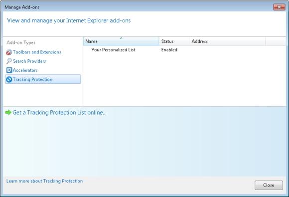 Mặc định, Tracking Protection Lists bị tắt. Để kích hoạt và cấu hình nó, hãy mở IE, nhấn phím Alt, chọn thực đơn Tools, và chọn Tracking Protection. Bạn sẽ thấy danh sách được tạo ra tự động dựa trên các trang web bạn truy cập, và bạn có thể tải về danh sách bổ sung. Để dùng nó, hãy chọn Your Personalized List và nhấn Enable.