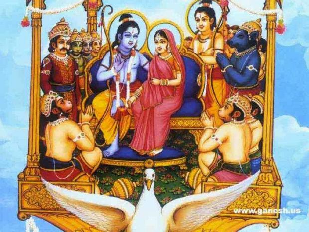 Bên trái: Rama đón chào sự trở lại của Ayodhya, với cỗ xe bay vào vũ trụ- cỗ xe Pushpak Vimana. Bên phải: Một minh họa của Shakuna Vimana giải thích cỗ xe bay như chim khi vỗ cánh và quặt đuôi, ở Bangalore, Ấn Độ, năm 1923. Bối cảnh nền: Một bức tranh chữ Phạn. (Wikimedia Commons)