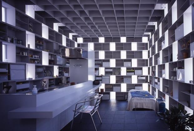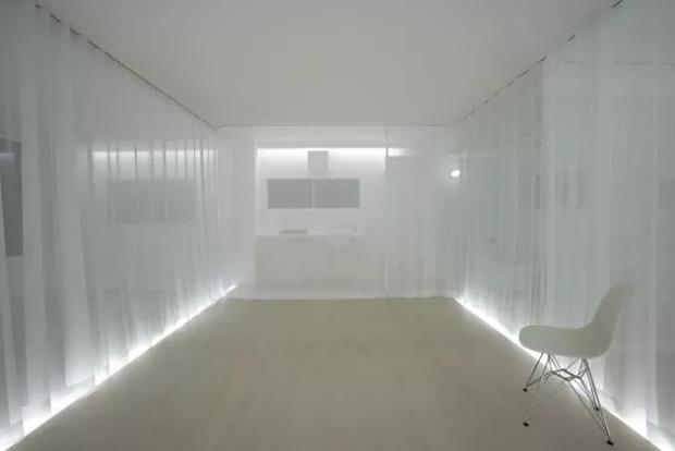 Những màn vải tinh tế treo dọc các bức tường được lấy cảm hứng từ nghệ thuật thư pháp hitofudegaki (một nét bút). Đèn gắn trên tường chiếu vào những bức màn khiến cho chúng trở nên nổi bật, chia không gian căn phòng làm ba phần và khiến người ta quên đi khuyết điểm thiếu ánh sáng của căn phòng.