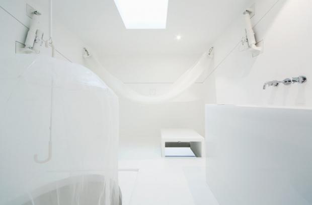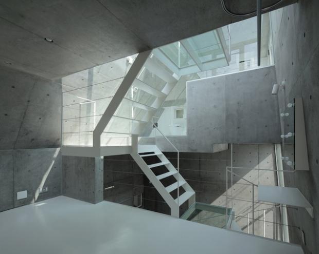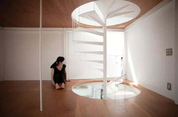 Những tia nắng mặt trời rọi xuống, len lỏi qua trần nhà tráng men và phòng tắm, qua cầu thang treo và sàn nhà bằng kính, chiếu sáng cho không gian sống với thiết kế chìm (sunken) của ngôi nhà nằm ở Tokyo này. Diện tích ngôi nhà chỉ vỏn vẹn gần 24m2, hoàn toàn vừa khít với vị trí góc phố siêu nhỏ.