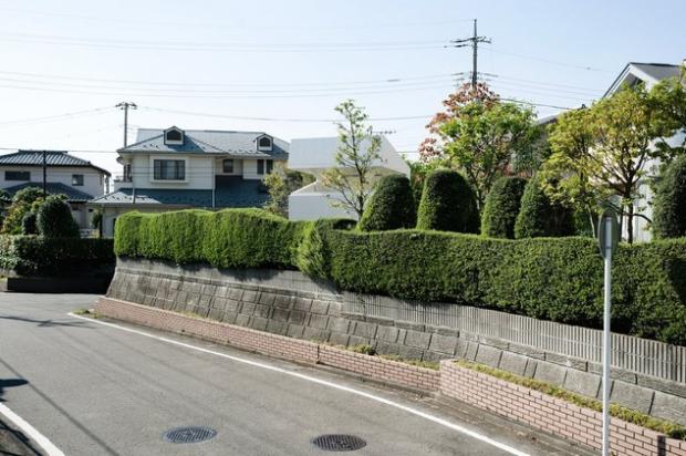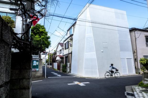 Với bức tường nghiêng được sơn trắng hoàn toàn, cửa sổ phủ kín, người ngoài khó có thể đoán được sự sắp xếp không gian nội thất cũng như tính tiện nghi của ngôi nhà này. Dù nằm ở vị trí ngã tư đường, ngôi nhà không hề gây cản trở dòng xe cộ di chuyển không ngớt xung quanh.