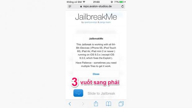 Bước 3: Trình duyệt sẽ tự động chuyển tiếp sang giao diện mới đi kèm chức năng Jailbreak thiết bị. Tại đây, bạn vuốt nút mũi tên ở phía dưới màn hình (Slide to Jailbreak) để tiến hành quá trình Jailbreak máy.