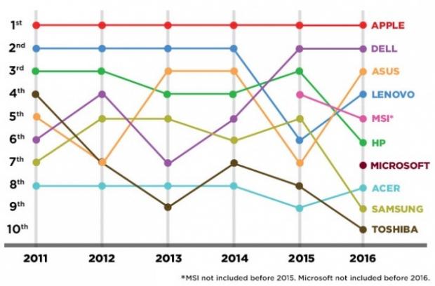 So với năm 2015, Apple và Dell đang chia nhau hai vị trí dẫn đầu với thế mạnh về thiết kế, đánh giá chung, hỗ trợ kỹ thuật và phần mềm. Dell nổi trội hơn Apple về giá thành cũng như đa dạng sự lựa chọn dành cho người tiêu dùng.