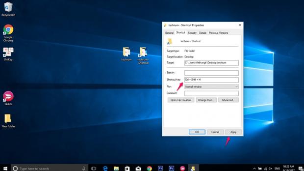 Bước 3: Click vào tab Shortcut. Đặt con trỏ chuột ở dòng Shortcut key sau đó nhập tổ hợp phím mà bạn mong muốn.